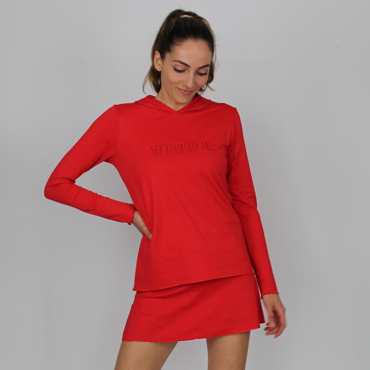 “Experimenta la máxima comodidad y rendimiento con la sudadera técnica de pádel free roja. El tejido técnico de poliamida y elastano de última generación proporciona una transpirabilidad excepcional y una rápida evacuación del sudor, manteniendo tu temperatura corporal regulada en todo momento. Su corte ajustado y elástico realza la silueta femenina, ofreciendo un ajuste perfecto que se mueve contigo en cada golpe. La capucha ligera y el diseño gráfico complementan este modelo, convirtiéndolo en una prenda versátil tanto dentro como fuera de la pista. Diseñada y fabricada en Barcelona, esta sudadera es la aliada perfecta para las deportistas que buscan lo mejor.”